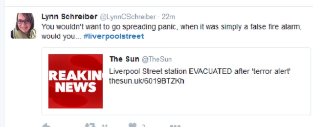 "Tocmai am fost evacuaţi din Liverpool Street. Nu am nicio idee ce s-a întâmplat. Se auzeau oameni strigând ceva despre un atac terorist. Un început de zi înfricoşător", este mesajul postat pe Twitter de un călător prezent la incident.