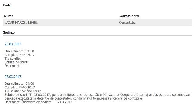 Procesul a fost amânat pentru data de 23 martie, "pentru emiterea unei adrese către Ministerul de Interne – Centrul de Cooperare Internaţională pentru a se cunoaşte perioada executată în detenţie de către contestator".