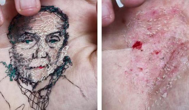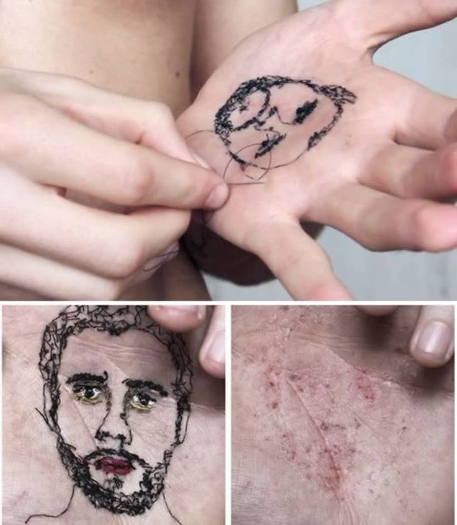 David Cata are puţin peste 20 de ani şi recurge la exprimarea dragostei şi a talentelor sale într-o manieră cel putin ciudată. Pe scurt, foloseste aţa şi acul pentru a crea portretele celor dragi. Partea uimitoare a acestei proceduri este că îşi foloseste propria-i piele ca ţesut! Proiectul său se numeşte Overexposed Emotions, iar partea corpului ce este folosită drept pânză sunt palmele. David Cata coase portretele respective, le folografiază apoi descoase opera, lăsând în urmă cicatrici adanci ţi palme sangerande. După vindecare repetă procesul. Cum ţi se pare? Vorbim de artă sau nebunie?