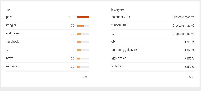 În creştere se află şi Preşedintele Klaus Iohannis. "Iohannis" este pe primul loc în ultimele 12 luni la căutare de ştiri, înregistrând o "creştere masivă". Câteva locuri mai jos se află "Ponta" şi "Putin", cu creşteri semnificative. La categoria imagini: "poze", "imagini" sunt urmate de "wallpaper" .