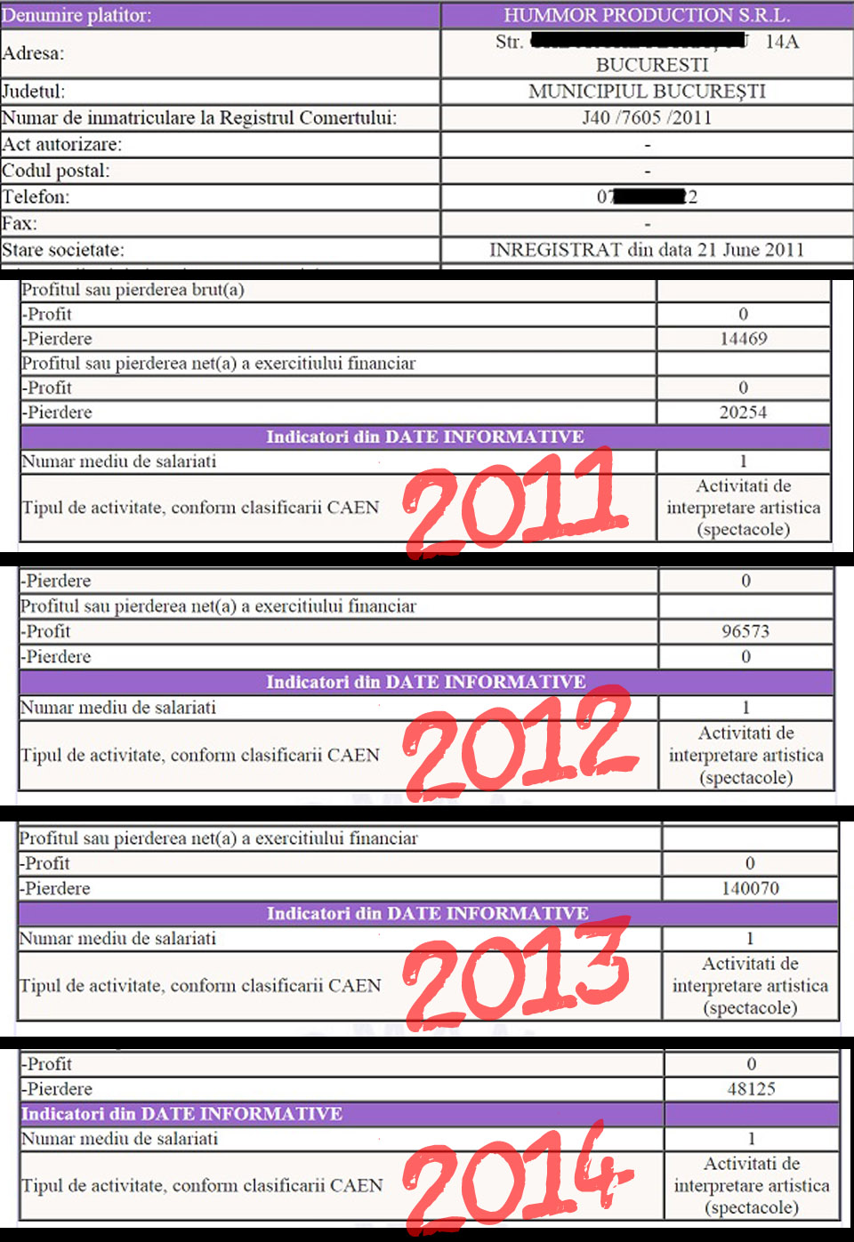 Pavel şi Anca Bartoş (soţia actorului, care în urmă cu patru ani era realizator coordonator la Radio România Junior) au fost acuzaţi de "jonglerii" cu bani publici, de către un fost parlamentar. Conform documentelor ajunse în spaţiul virtual (vedeţi documentele aici), Anca ar fi întocmit o cerere către conducerea Societăţii Române de Radiodifuziune, prin care cerea să fie prelungit un contract de prestări servicii pentru postul Radio România Junior de către firma Hummor Production, deţinut de... soţul ei! Conform actelor respective, Pavel Bartoş urma să încaseze lunar 40.000 de lei. Reporterii SPYNEWS au descoperit, însă, că firma care, conform documentelor, primea aproape jumătate de milion de lei pe an, a declarat în perioada 2011-2014 eşecuri financiare. Conform datelor oficiale (facsimil jos), în 2011 firma lui Bartoş a avut pierderi de 20.254 lei, iar în 2012 a avut un profit de 96.573 lei. Acesta a fost singurul an bun pentru prezentatorul TV. În 2013, firma a avut o "gaură" de 140.070 lei, iar în 2014 a înregistrat din nou pierderi în valoare de 48.125 lei. Cum a fost posibil ca o firmă cu un singur angajat, care a încasat sute de mii de lei, să iasă numai în pierdere, este, cu siguranţă, o enigmă!
