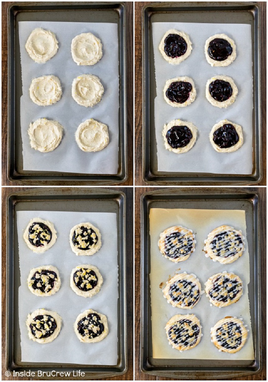 Preâncălziţi cuptorul la o temperatură de 200 de grade şi tapetaţi trei tăvi cu foi de copt. Într-un vas se amestecă dulceaţa de coacăze cu zahărul şi untul. Apoi se adaugă laptele şi coaja de lămâie şi se amestecă cu o furculiţă până ce se obţine un aluat lipicios. Se pun şase linguri de aluat în fiecare tavă. Utilizati spatele unei linguri pentru a crea un puţ în centrul fiecări prăjituri în care se adaugă dulceaţa de coacăze. Utilizaţi un mixer pentru a obţine topingul de rumenire. Apoi sfărâmiţaţi în mod egal pe fiecare prăjitură. Se introduc la cuptor şi se coc timp de 10 minute. După ce prăjiturile sunt gata se lasă timp de câteva minute la răcit, apoi se presară pe fiecare zahărul pudră şi sucul de lămâie. Este indicat să se depoziteze într-un recipient sigilat.