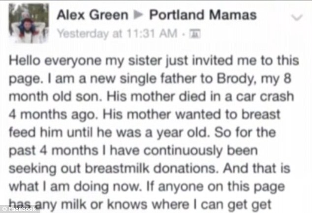 "Salut tuturor! Sora mea m-a invitat în acest grup. Eu sunt un tată singur pentru Brody, băieţelul meu de 8 luni. Mama lui a murit într-un accident de maşină în urmă cu 4 luni. Ea îşi dorea ca Brody să fie alăptat până la vârsta de 1 an. În ultimele 4 luni am căutat constant donatoare de lapte matern. Asta fac şi aici, acum. Dacă este cineva în acest grup care are lapte matern sau ştie de unde aş putea lua...", a scris Alex Green pe o reţea de socializare.