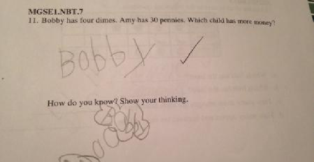 Un băieţel de şase ani a arătat că dă dovadă de o logică strălucitoare la o lucrare de control la matematică. Problema suna cam aşa. "Bobby are 4 monede de 10 cenţi. Amy are 30 de monede de un cent. Care din ei are mai mulţi bani?".