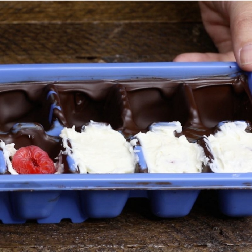 Se topeşte ciocolata în cuptorul cu microunde timp de aproximativ 30-40 de secunde, până ce aceasta devine lichidă. După care se toarnă într-o formă pentru cuburile de gheaţă şi se pune la rece timp de cinci minute. Într-un vas se amestecă brânza, zahărul şi esenţa de vanilie până ce se obţine o compoziţie omogenă. Apoi se pune, aproximativ, o pătrime în fiecare cub după care se pune câte un fruct de zmeură, se adugă crema de brânză şi se acoperă cu ciocolată. Apoi se pune tava la congelator timp de o oră.