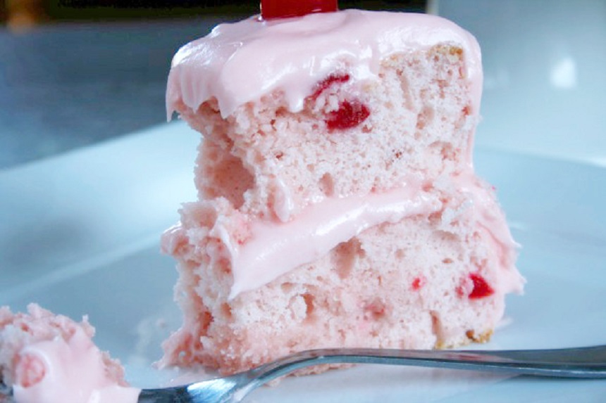Blatul- Preîncălziţi cuptorul la o temperatură de 170 de grade şi tapetaţi două tăvi de copt rotunde. Într-un castron se amestecă făina, praful de copt şi sarea. Într-un alt vas se amestecă untul şi zahărul până ce se obţine un amestec pufos. Îmbinaţi amestecul de făină cu cel de unt, iar la final adăugaţi cireşele, sucul de cireşe, laptele şi extractul de migdale. Într-un alt bol mixaţi bine albuşurile de ou, după care adăugaţile în amestecul precedent. Amestecul obţinut se toarnă în mod unifoem în cele două tăvi. Se introduc la cuptor şi se cot timp de aproximativ 30-35 de minute. Înainte de a scoate blatul din formele de copt se lasă la răcit timp de 10 minute. -