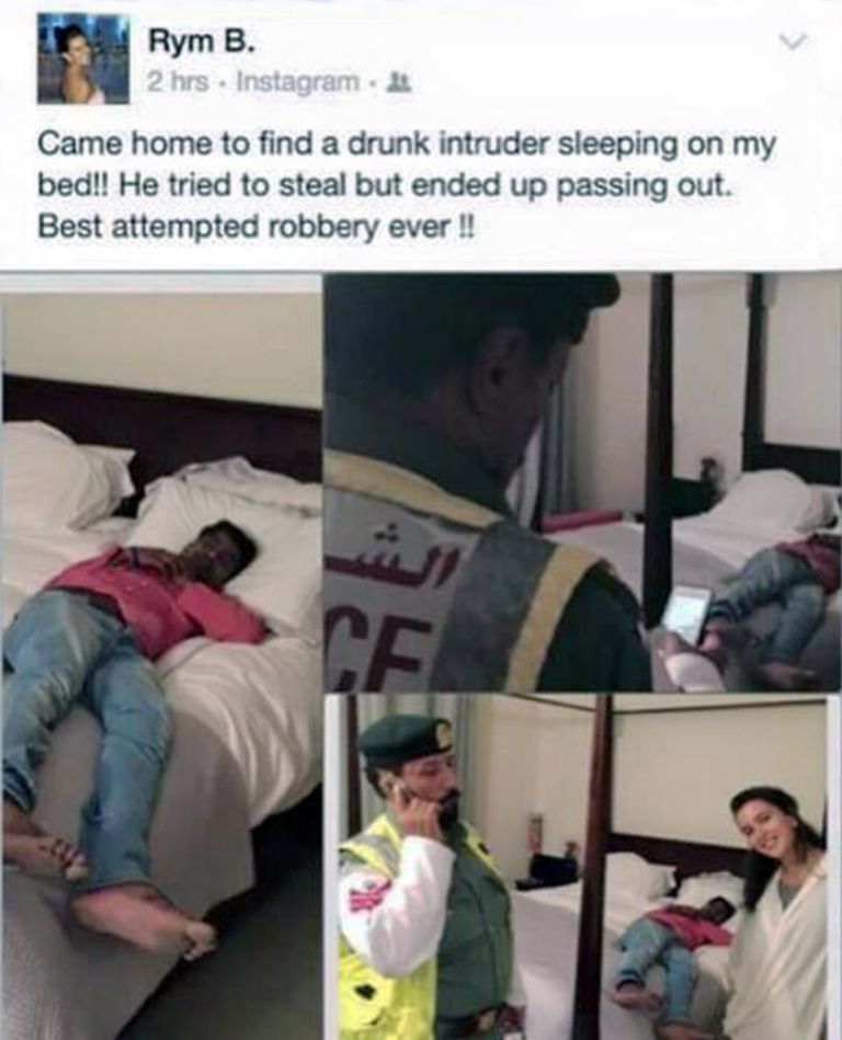 "Am ajuns acasă şi am găsit un bărbat beat dormind în patul meu. A încercat să fure, da oboseala l-a ajuns. Cea mai reuşită încercare din furt!", a fost comentariul ironic al femeii, la publicarea imaginii.