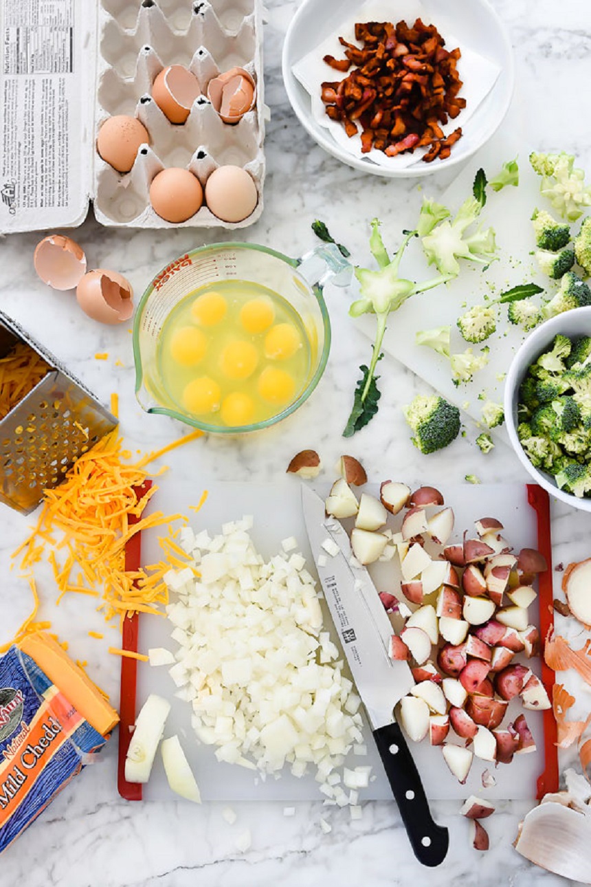 Se preîncălzeşte cuptorul la o temperatură de 180 de grade. Într-o tigaie medie se pun cartofii, ceapa şi se apă, până ce legumele sunt acoperite complet. Se lasă la fiert aproximativ 6-8 minute. Între timp într-o altă tigaie se căleşte baconul, la temperatură medite timp de 5-6 minute. După ce baconul este gătit se scoate pe o farfurie. În aceeşi tigaie se adaugă broccoli şi se găteşte timp de 3-4 minute. După ce acesta se înmoaie se adaugă ceapa, cartofii şi baconul. Se gătesc timp de 3-4 minute.