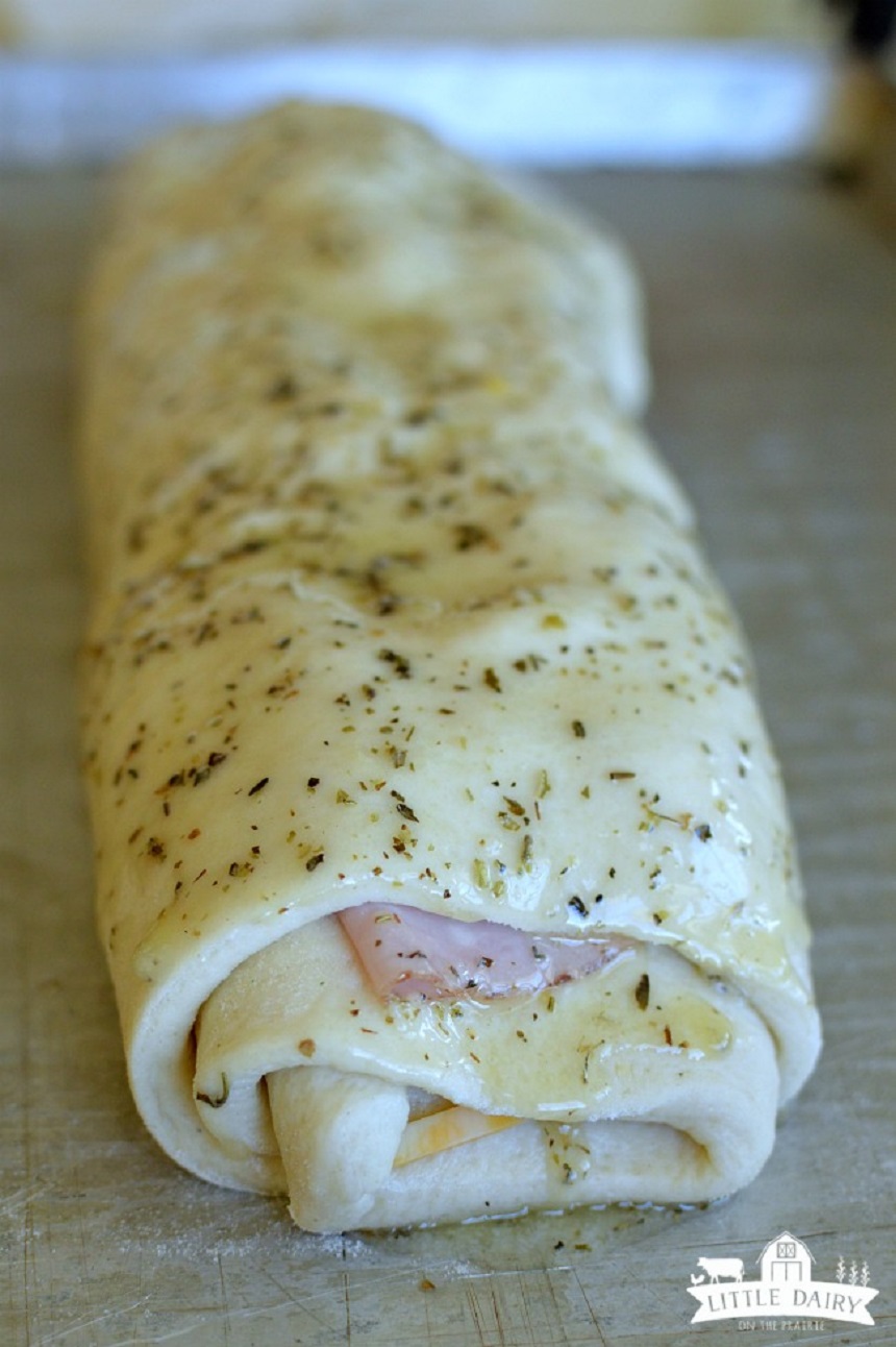 Preîncălziţi cuptorul la teperatura de 180 de grade şi tapetaţi o tavă cu foaie de copt. Se amestecă oule şi se lasă deoparte timpă de un minut. Pe blatul din buctărie se întinte aluatul de pizza şi se unge cu 1/3 din amestecul de ouă. Apoi se aşează 1/3 din feliile de brânză, iar peste acestea se pun feliile de şuncă presată. Se ruleză aluatul într-un singur rând. Se repetă acest procedeu. Ruloul obţinut se unge cu unt şi se presară condimentele. Se introduce la cuptor şi se coace timp de aproximativ 20-25 de minute. Se serveşte imediat.