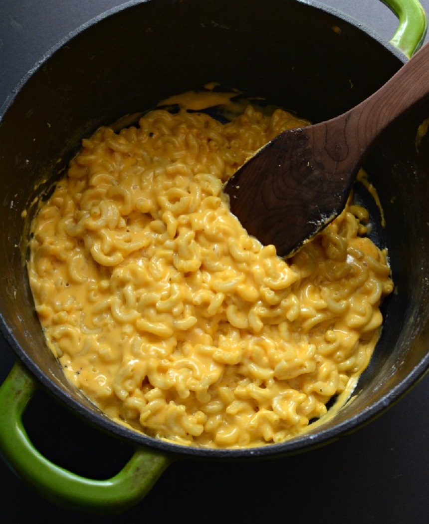 Într-o oală mare se adaugă laptele, untul şi pastele. Se lasă la fiert aproximativ 10 minute, la foc mediu, amestecând deseori. Apoi se adaugă brânza şi sarea şi se amestecă până ce brânza se topeşte complet. Se serveşte imediat.