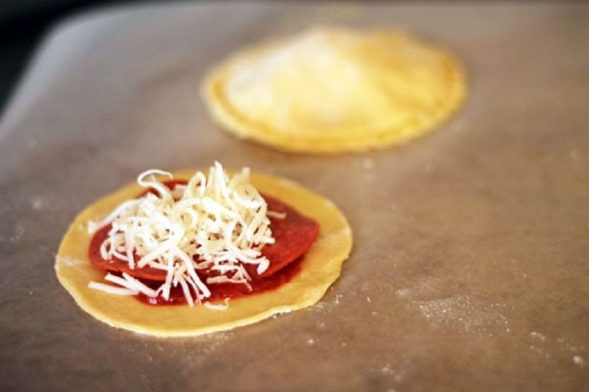 Prîncălziţi cuptorul la o temperatură de 170 de grade. Se întinde aluatul pe o surafaţă plată, tapetată în prealabil cu făină. Cu ajutorul unui cuţit se decupează cercuri din cocă. Cercurile obţinute se împart în două. Pe jumătate din ele se pune sosul de pizza, câte o felie de salam, şi mozzarella. Apoi se acoperă fiecare cerc în parte şi se îmbină marginile pentru ca acestea să nu se desfacă în cuptor. Introduceți pacheţelele în cuptor şi se coc timp de 10-15 minute. La final se unge fiecare pacheţel cu unt. Se servesc imediat.