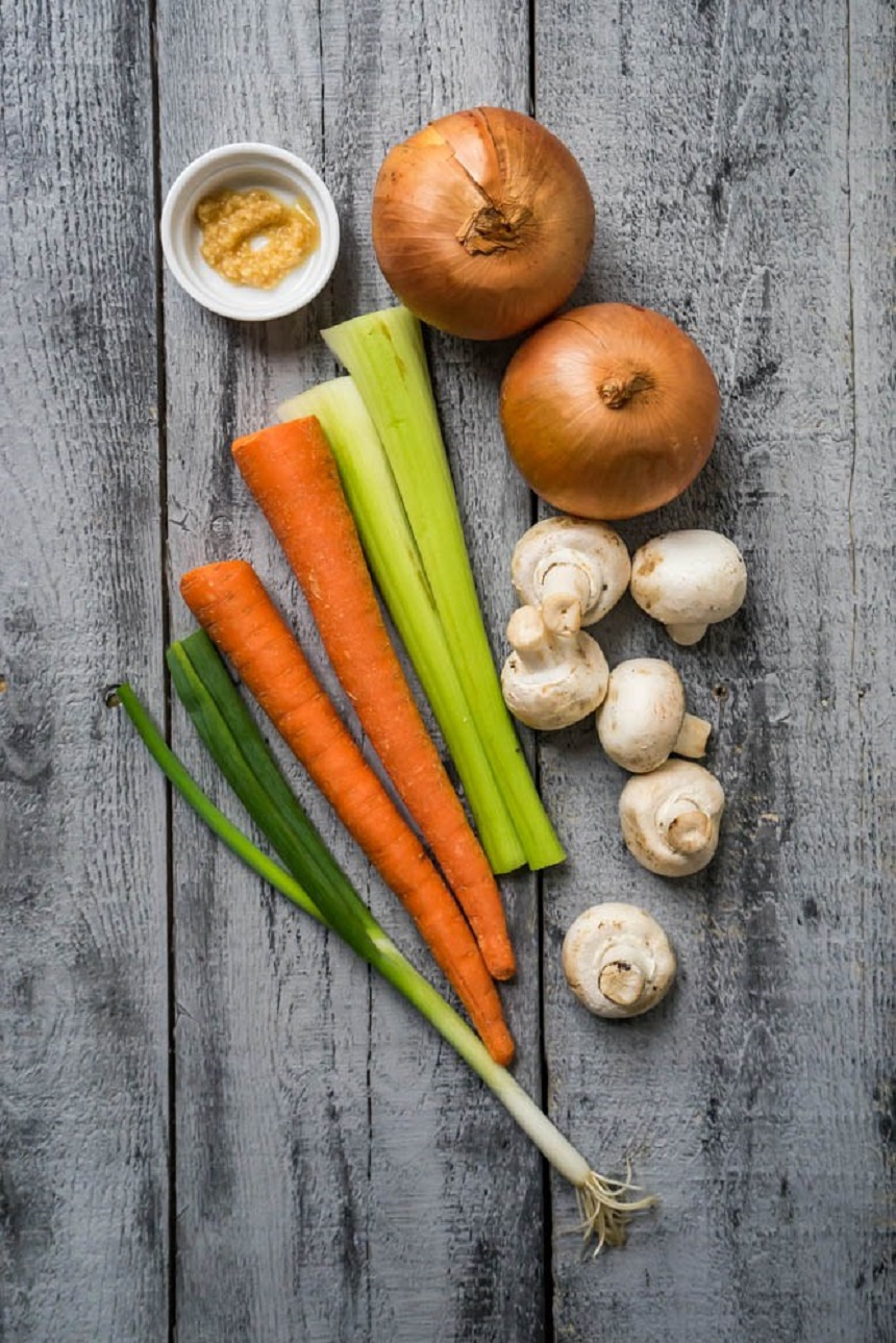 Se căleşte ceapa într-o oală până ce acesta capătă culoarea brună. Se adaugă morcovul, ţelina, usturoiul şi supa de legume. Se lasă la fiert timp de aproximativ 30 de minute. Se îndepărtează legumele şi apoi se adaugă ciupercile. Se serveşte imediat.