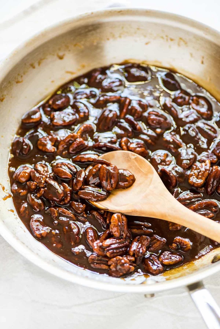 Într-o tigaie, la foc mediu, se pun nucile şi se călesc timp de 3-4 minute, apoi se adaugă untul şi uleiul de cocos, iar după ce untul s-a topit se adaugă mierea, scorţişoara, nucşoara, sarea şi piperul. Se lasă să fiarbă timp de aproximativ 4-5 minute. După ce amestecul a început să fiarbă se adaugă 1/4 cană de whisky şi se mai ţine pe foc timp de cinci minute până ce sosul se reduce şi capătă consistenţă.