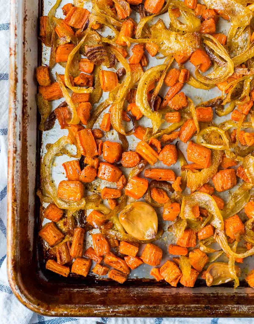 Pentru început, se preîncălzeşte cuptorul la o temperatură de 180 de grade şi se tapetează cu hârtie de copt o tavă. Într-un caston mare, se pun morcovii, tâiaţi în felii subţi, ceapa şi usturoiul. Se asezonează cu o ulei de măsline, o linguriţă de sare, 1/2 linguriţă de piper şi chimen. Se amestecă până ce toate ingredientele se combină, iar apoi se pun legumele în tava, într-un singur strat. Se gătesc, timp de aproximativ 25-30 de minute. După ce legumele s-au rumenit, se scot pe un platou şi se lasă să se răcească, timp de 10 minute.