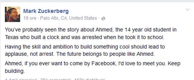 "Probabil aţi auzit povestea lui Ahmed, un elev din Texas, în vârstă de 14 ani, care a inventat un ceas şi a fost arestat pentru că l-a purtat la şcoală. Aptitudinile şi ambiţia de a construi ceva inovativ, pentru care ar trebui să fii lăudat, nu arestat. Viitorul aparţine oamenilor ca Ahmed. Ahmed, dacă vreodată o să-ţi doreşti să vii la Facebook, mi-ar plăcea să te întâlnesc. Continuuă să inventezi", i-a transmis fondatorul Mark Zuckerberg puştiului.