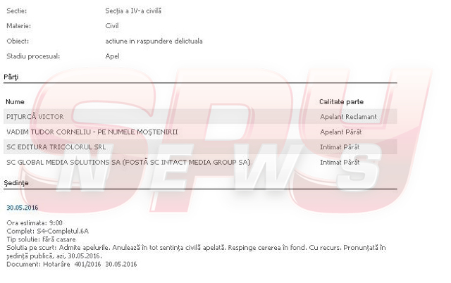 La aproape un an de la moartea politicianului, judecătorii i-au dat câştig de cauză în procesul în care Victor Piţurcă îi cerea daune morale de un milion de euro. Judecătorii au anulat "în tot sentinţa civilă apelată" şi au respins cererea introdusă de antrenor. Decizia judecătorilor vine la două luni după ce avocatul lui Victor Piţurcă anunţa faptul că este dispus să renunţe la proces, în condiţiile în care Vadim Tudor era reprezentat acum de fiicele sale. Pentru a pune capăt ostilităţilor, Curtea de Apel Bucureşti a stabilit atunci ca Piţurcă "să se prezinte personal sau prin mandatar cu procură specială" la termenul de judecată din 30 mai. Lucru care, dacă e să ne luăm după decizia instanţei, nu s-a întâmplat.