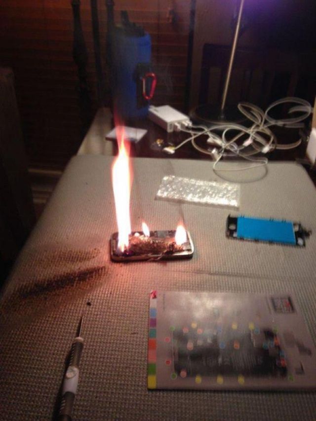Un tânăr din America a fost luat prin surprindere şi totul putea să se termine tragic, atunci când a încercat să-şi schimbe bateria de la telefonul mobil. După ce a deschis carcasa telefonului, şi a înlocuit bateria s-a ridicat de la masă pentru a merge la bucătărie să-şi ia un pahar cu apă, când a auzit un zgomot ciudat. Când s-a întors, telefonul lui era în flăcări şi a rămas fără cuvinte gândindu-se la ce ar fi putut păţi dacă ar fi fost lângă mobil atunci când s-a întâmplat incidentul.