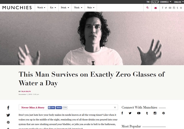 "Iniţial mi-am început dieta cu fructe şi legume crude, dar am revenit la hrana gătită, care include şi grătare, şi fripturi, după ce mi-am dat seama că mă trezeam în fieare noapte de două-trei ori să merg la toaletă să urinez. Mă simt mult mai bine de când nu mai beau apă pentru că nu mai bag în organism clor şi fluor", a declarat băiatul.