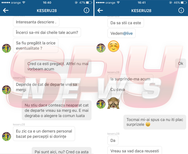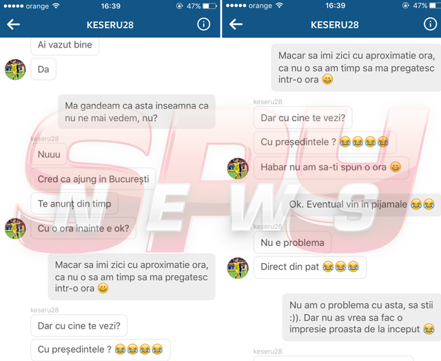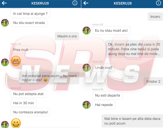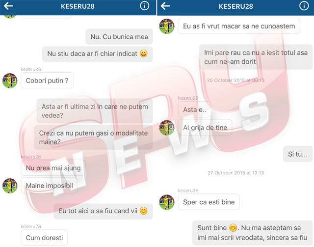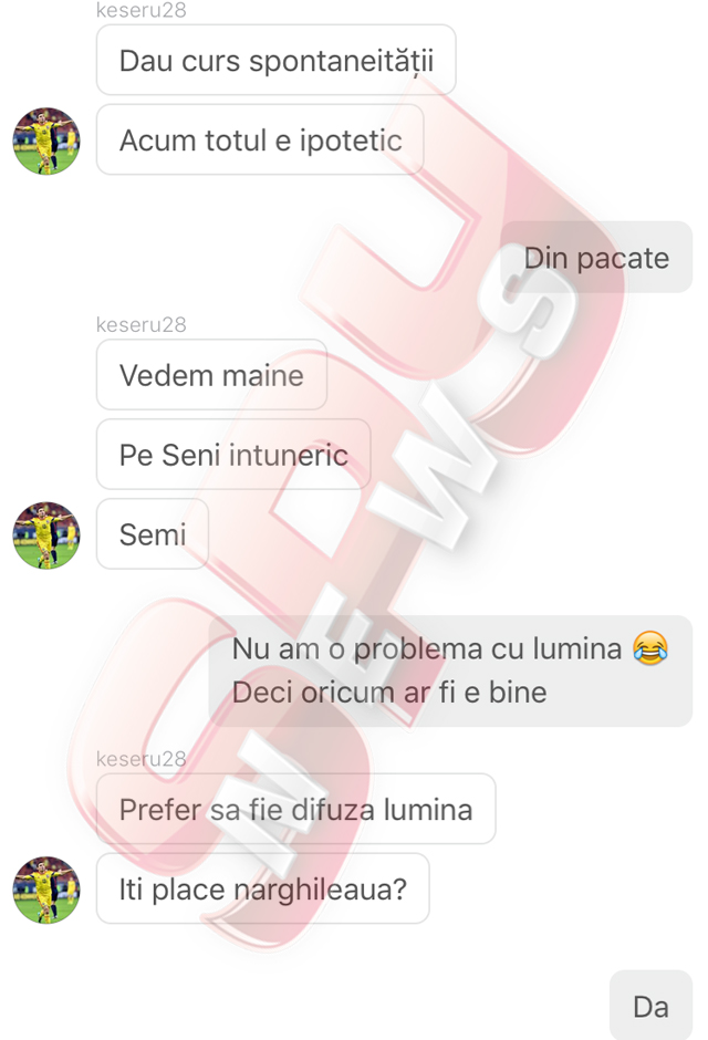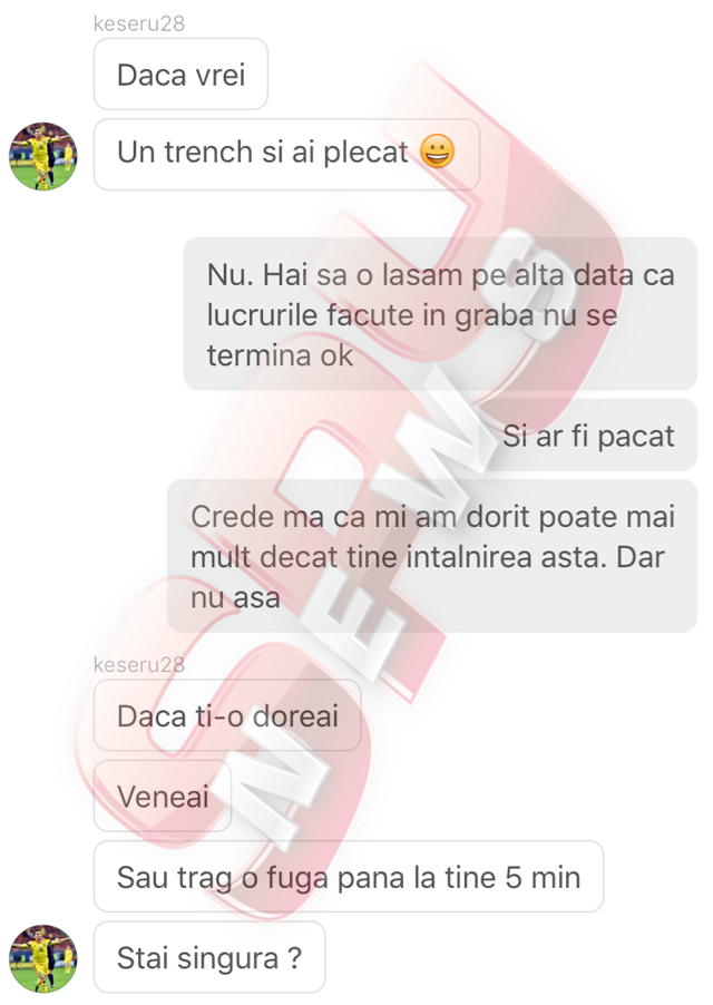 Până la marea întâlnire, conversaţiile dintre cei doi avansau, atacantul devenind din ce în ce mai curios în ceea ce o priveşte pe studenta focoasă. Astfel, după ce a terminat meciul pe care l-a avut în Bulgaria, la echipa Ludogorets, Keşeru s-a urcat în bolidul personal şi a venit în Capitală. "Ai chef să ieşi? În cât timp ai ajunge?", a întrebat-o fotbalistul. "Maxim o oră", i-a răspuns blonda. Replica bărbatul nu a întârziat să apară: "Prea mult. Nu pot aştepta atât. Hai în 30 de minute. Nu contează aranjatul. Eu nu stau mult aici", i-a spus Keşeru extrem de precaut, primind probabil o "permisie" scurtă de la soţia lui. "Unde stai? Hai repede. Dacă nu ai timp, vin eu preţ de câteva minute la tine. Stai singură? Sau măcar coboară puţin. Mâine mi-e imposibil să mai plec", i-a scris atacantul naţionalei, extrem de dornic de a o întâlni pe focoasa blondă.