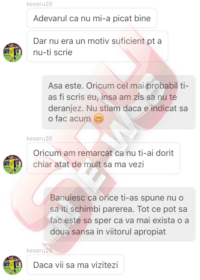Deşi tânăra i-a dat ţeapă în acea sâmbătă şi l-a lăsat pe bihorean cu buza umflată, el nu s-a descurajat. Cum perseverenţa e cheia succesului, Keşeru şi-a încercat din nou norocul şi a căutat-o pe tânăra misterioasă. "Nu mi-a picat deloc bine că nu ne-am văzut, însă nu era un motiv suficient pentru a nu-ţi scrie. Oricum am remarcat că nu ţi-ai dorit chiar atât de mult să mă vezi", i-a spus fotbalistul, uşor dezamăgit. Văzând că încă există dorinţă de ambele părţi, bărbatul plusează chemând-o pe tânăra în Bulgaria, deşi abia o cunoştea.