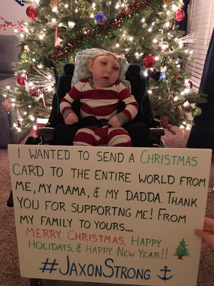 "Vreau să vă trimit o scrisoare de Crăciun lumii întregi în numele meu, al mamei şi al tatei. Vă mulţumesc pentru susţinere. De la familia mea pentru voi, Crăciun fericit, Sărbători fericite şi un An Nou fericit. Jaxon Puternicul", este scrisoarea transmisă de părinţii copilului fără cap în numele acestuia.
