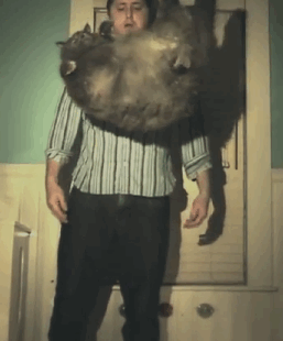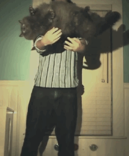 Stăpânul unei pisici mai mult decât grăsuţe s-a filmat în compania animalului, iar într-un moment de neatenţie, el a scăpat-o din braţe. Momentul a fost editat şi transformat în slow motion, iar imaginile sunt hilare.