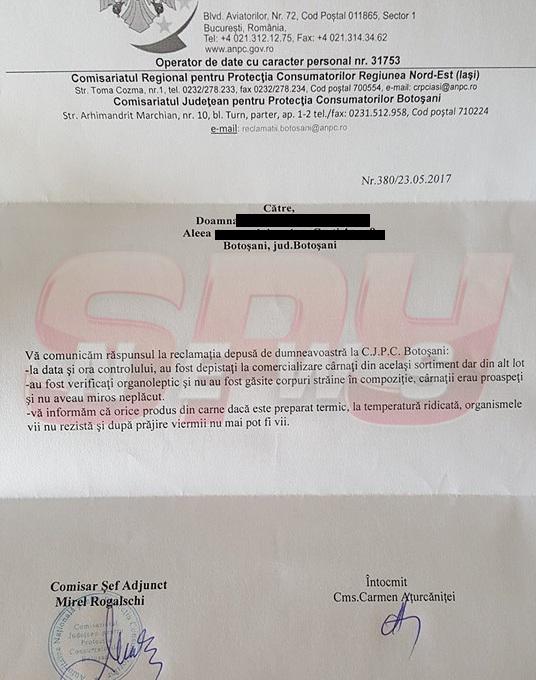 Gabriela H. a explicat, ieri, că a primit un răspuns halucinant de la Protecţia Consumatorului, după ce a sesizat instituţia cu privire la un caz şocant. "Cu aproximativ o luna în urmă am cumpărat de la un renumit market cârnaţi proaspeti (vorba vine)... După ce i-am prăjit, au început să iasa din ei viermi! Bineînţeles, am fost la Protecţia Consumatorului, iar rezultatul a venit astăzi şi, aşa cum mă aşteptam, nicio rezolvare", a declarat femeia.