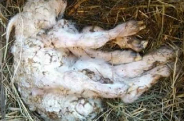 Animalul are dispuse patru picioare în faţă, două în zona pieptului şi două în zona burţii, iar alte două picioare erau poziţionate normal, în partea posterioară a corpului. Mielul a trăit doar 5-6 ore, asta probabil din cauza malformaţiei genetice.