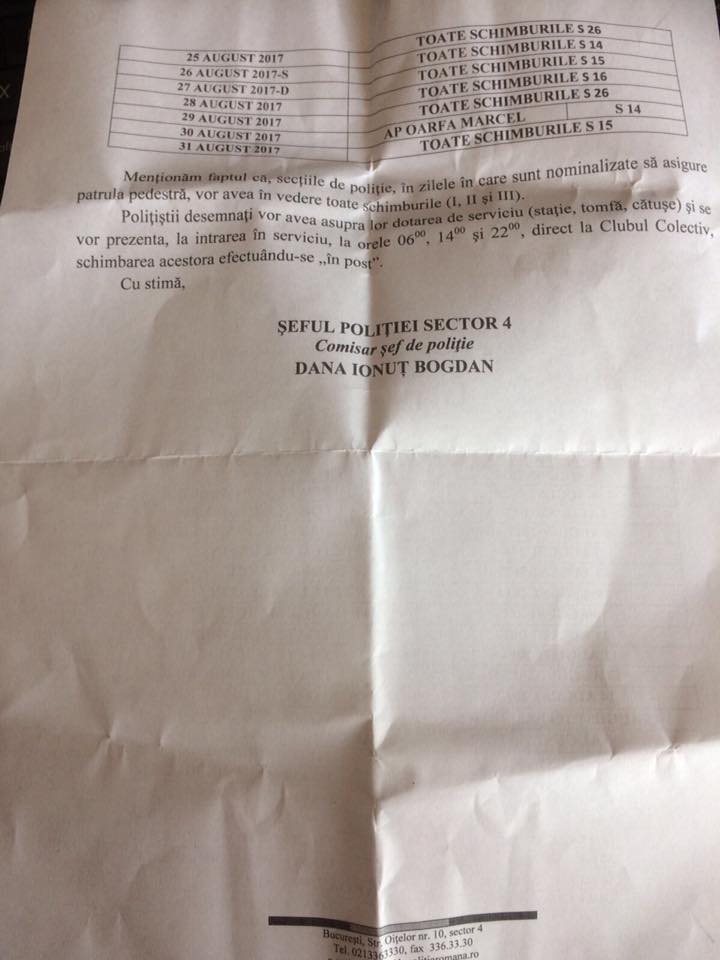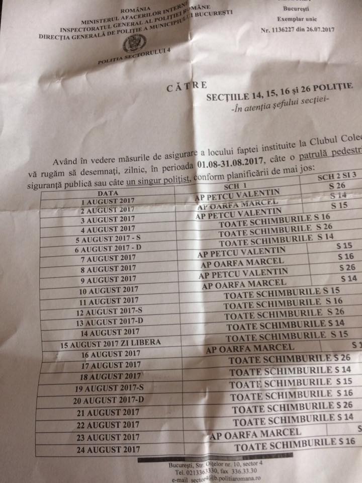 Ştefan-Adrian Paraschiv, preşedinte S.P.R. “Diamantul” - sector 4 susţine că agenţilor care păzesc 24/24 Clubul Colectiv, câte unul pe tură, le este teamă să mai meargă la serviciu, după ce colegi ai lor din ţară au fost ucişi în timpul serviciului. “Un alt fapt mult mai grav este repartizarea in postul de la clubul Colectiv a poliţiştilor puşi la dispoziţie (aceştia nu au armament), iar dacă se întâmplă vreun eveniment, aceştia ce fac? Dau cu pietre, dau cu fuga sau suna la 112. Un precedent s-a creat saptamana trecuta, cand membrul nostru de sindicat ASP. Postolache Mihai a refuzat in scris conform Acordului Colectiv de Munca sa nu isi desfasoare singur serviciul in postul de paza de la Colectiv, sfatuim pe aceasta cale toti politistii repartizati sa lucreze singuri sa refuze in scris acest abuz. In opinia noastra ASP. Postolache Mihai ar trebui recompensat cu o recompensa pe care dvs. o veti stabili pentru modul in care a refuzat sa se lase supus unui abuz, atragand totodata atentia si conducerii Politiei Sectorului 4 despre aceste abuzuri. In consecinta cunoscand lipsa de personal solicitam conducerii politiei capitalei sa suplineasca schema de personal de la sectii cu politisti proveniti din randul celor ce nu executa activitati de politie: psihologi (poate mai plange cineva si ii pot consilia loco), resurse umane, serviciul cabinet, financiar, compartimentul disciplina (cei care numara abaterile politistilor si le centralizeaza), control intern, presa, relatii cu publicul, implementari date, compartimentul vesela si puzderia de secretare si secretari care nu au atributii decat de a pune o stampila si a face o cafea sefului”, a punctat Ştefan-Adrian Paraschiv.