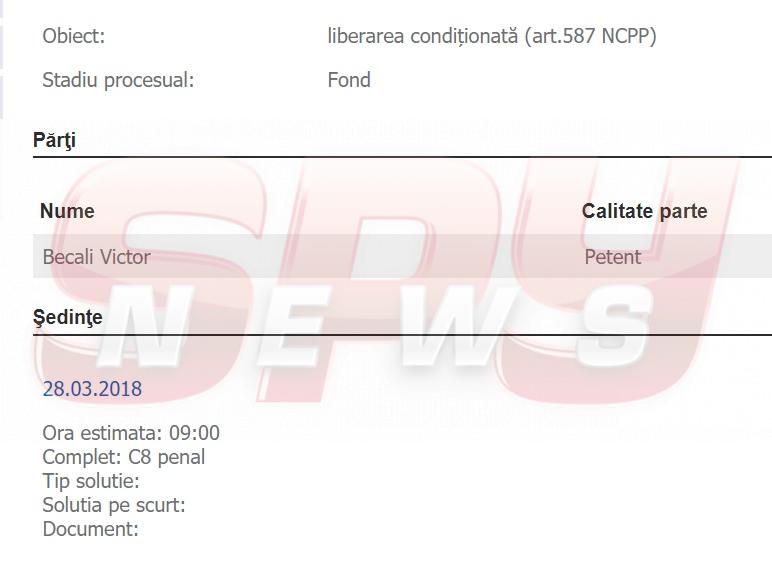 Fostul impresar FIFA a deschis, zilele trecute, la Judecătoria Sectorului 5, un proces în care a solicitat să i se aprobe cererea de liberare condiţionată. Ziua decisivă este 28 martie, când magistraţii vor admite cererea deţinutului sau vor stabili o altă dată, peste câteva luni, când acesta va putea depune o nouă cerere. Victor Becali ar putea avea probleme în această privinţă, din cauza unui dosar rămas nerezolvat. În luna ianuarie, când judecătorii au decis să fie eliberat, Victor Becali a fost la un pas să rămână în spatele gratiilor și numai norocul a făcut ca fostul impresar FIFA să iasă mai devreme din închisoare. Acesta lăsase în pușcărie o anchetă neterminată, declanșată după o percheziție.