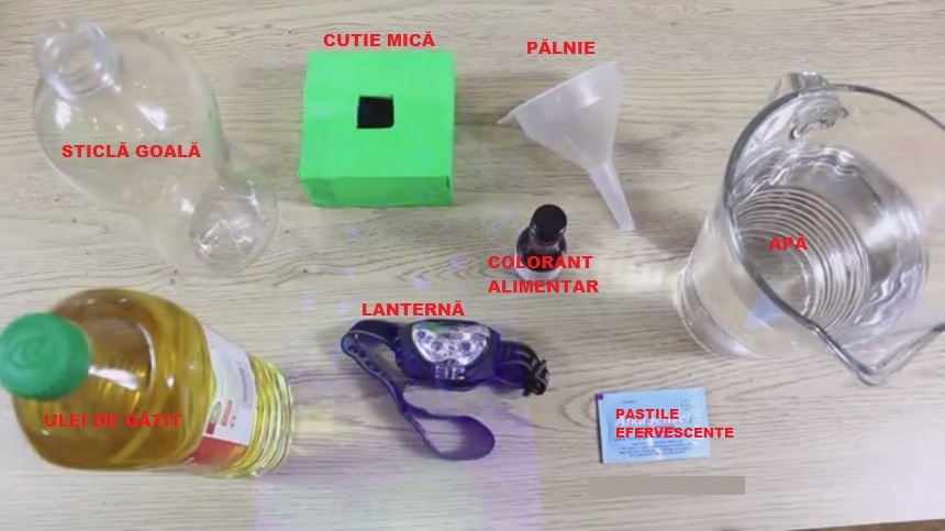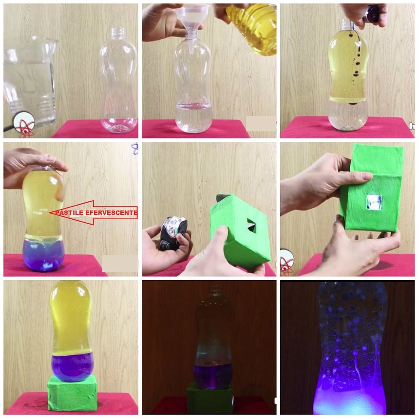 Tot ce trebuie să faci este să torni apa, uleiul și colorantul alimentar în sticlă. Apoi adaugi alka saltzer. Găurește cutia încât lumina lanternei să treacă prin ea. Prinde lanterna în interiorul cutiei și asează sticla desupra. Închide lumina și mai adaugă treptat alka saltzer pentru a menține “bolboroseala”. Veioza ta este gata !