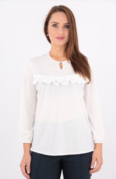 Ultima recomandare din această lista este o bluza delicată, pe care nu ai cum să nu o iubești: Bluza albă cu volanas din dantelă. Dacă îți plac ținutele feminine, cu elemente romantice, această piesă vestimentară își va găși cu ușurință locul în garderoba ta. Prezintă un decolteu rotund cu decupaj si un volanas din dantelă simpatic în partea din față.
