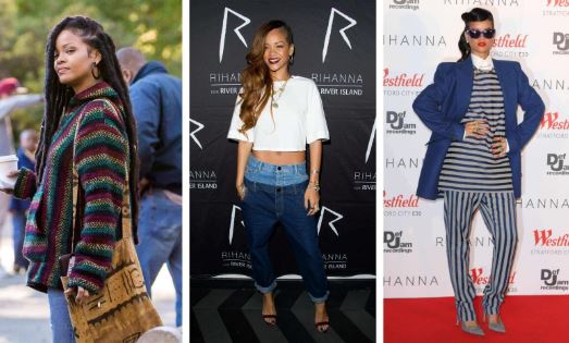 Rihanna stăpânește la perfecțiune stilul glamour grunge, știe să se pună mereu în valoare și strălucește în orice ținută, chiar și în cele masculine. Accesoriile sunt alese pe sprânceană, iar buzele sale se asortează întotdeauna cu îmbrăcămintea.