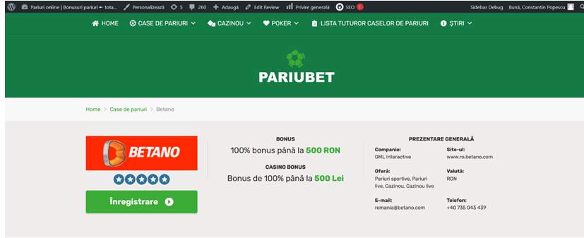 Aşa este cunoscută Betano în Grecia şi Cipru, de exemplu, unde este cunoscută de foarte mulţi ani. Betano a venit pe piaţa din România în 2016. De asemenea, trebuie să ştii că Betano este o casă de pariuri licenţiata, obţinând o licenţă valabilă din 2017 până în 2027, deci poţi juca fără să îţi faci griji de securitatea datelor sau a plăţilor. Trebuie să ştii că Betano a câştigat cele mai multe premii în cadrul premiilor caselor de pariuri online din România, ediţia 2022. Betano este fost sponsor Liga 1 a României şi actual sponsor CS U Craiova.