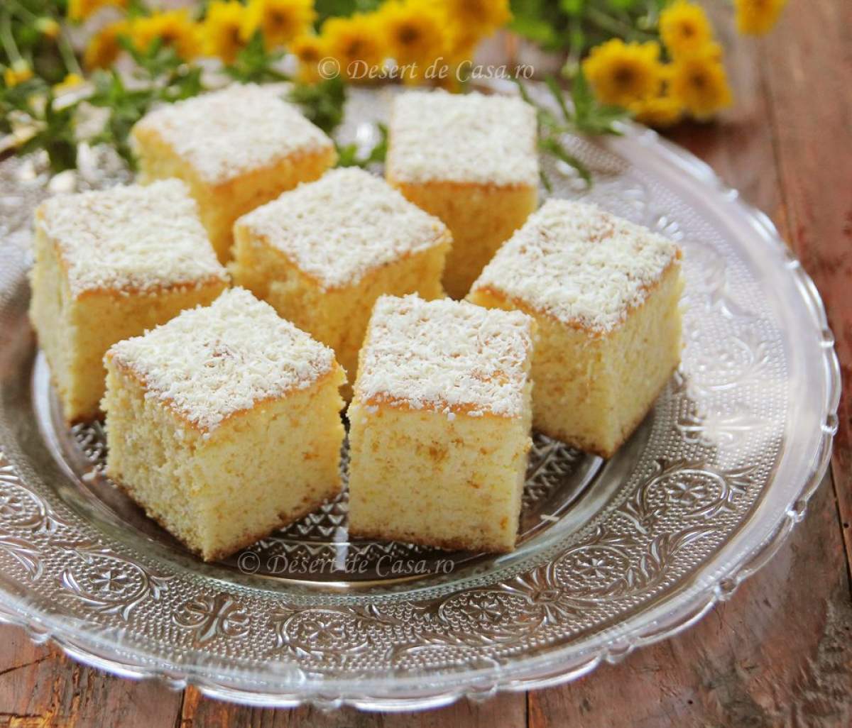 Adăugăm făina treptat și praful de copt și amestecăm de jos în sus până când omogenizăm compoziția, iar apoi adăugăm într-o tavă tapetată cu hârtie de copt și o punem în cuptorul preîncălzit la 180 °C pentru 20 de minute. Pentru decor puteți adăuga ciocolata albă sau fulgi de cocos. Poftă bună!