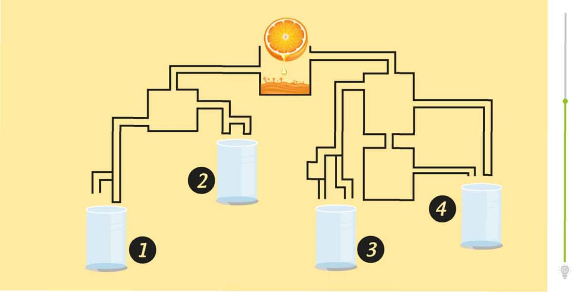 Pentru a răspunde corect în cele 20 de secunde trebuie să urmărești numărul de spații prin care se varsă sucul de portocale. Prima intuiție va fi să spui că este numărul 1 cel corect, însă ar trebui să te mai uiți o dată.