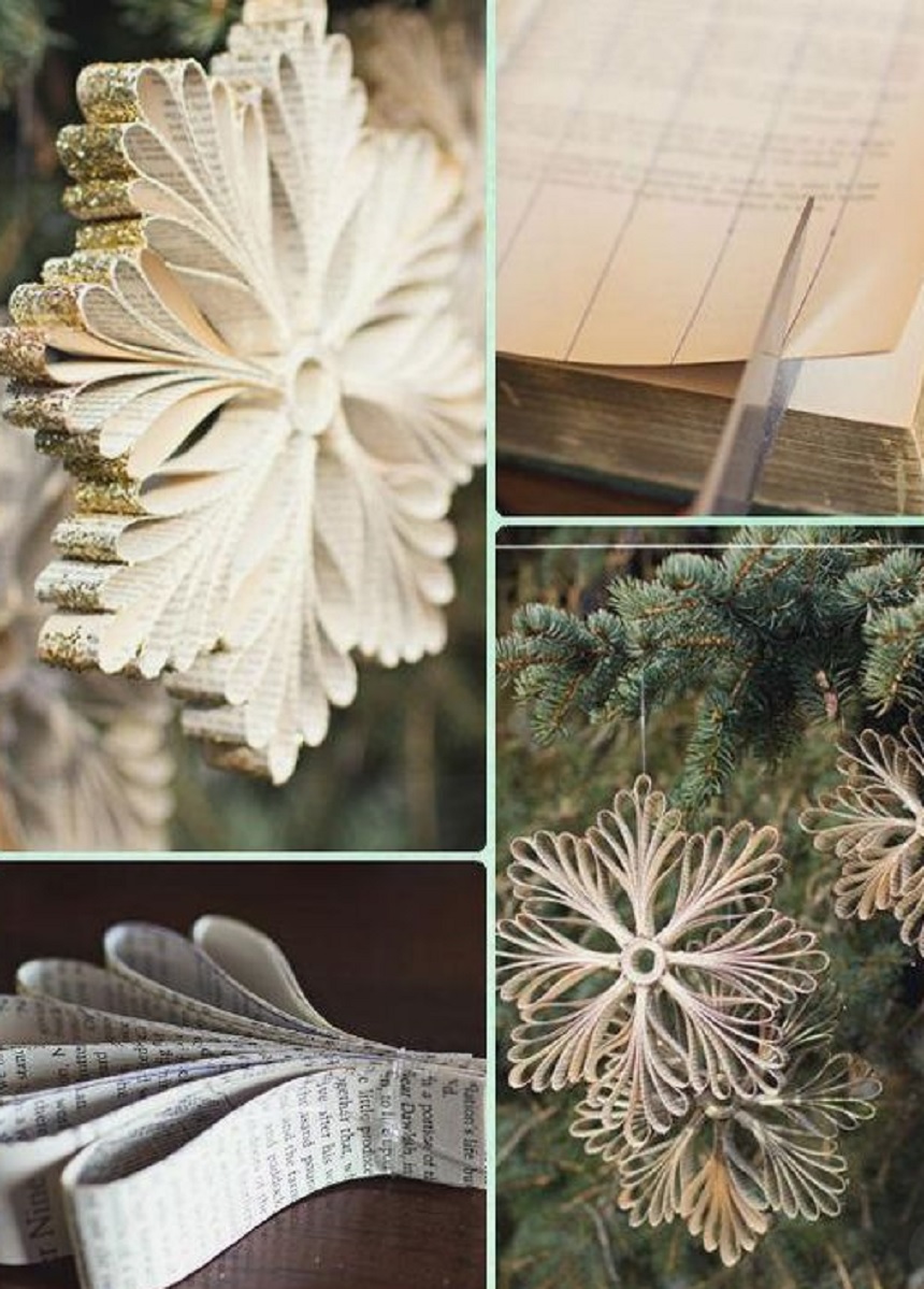 O altă idee este să tai fâșii din ziare vechi, pe care să le lipești în formă de fulg de nea și apoi să le așezi în brad.