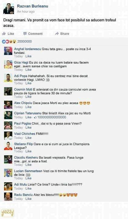 „Dragi români, vă promit că vom face tot posibilul să aducem trofeul acasă”, a scris falsul Burleanu, iar „Cosmin Moţi” a spus: „E adevărat că, din cauza caniculei, vom avea pauză de ţigară la fiecare 30 de minute?”.