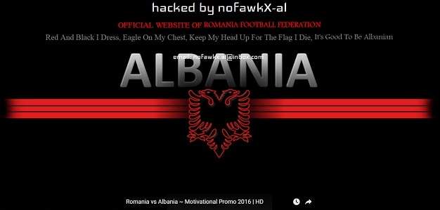 www.frf.ro a fost colorat în roşu şi negru, culorile drapelului albanez. Pe homepage este scris Albania şi stema federaţiei albaneze.