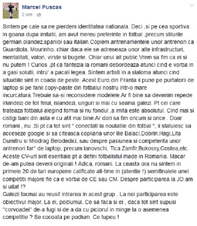 „Suntem artiști în a slaloma atunci când situațiile sunt în coadă de pește. Acest Euro din Franța îi pune pe purtătorii de laptop și pe fanii copy-paste din fotbalul nostru într-o mare încurcătură. Trebuie să-și reconsidere modelele. Suntem pe cale să ne pierdem identitatea naţională. Deci, şi pe cea sportivă. În goana după imitaţii, am avut mereu preferinţe în fotbal ,precum stilurile german,olandez,spaniol sau italian. ”, a scis, pe contul personal de Facebook, Marcel Puşcaş.
