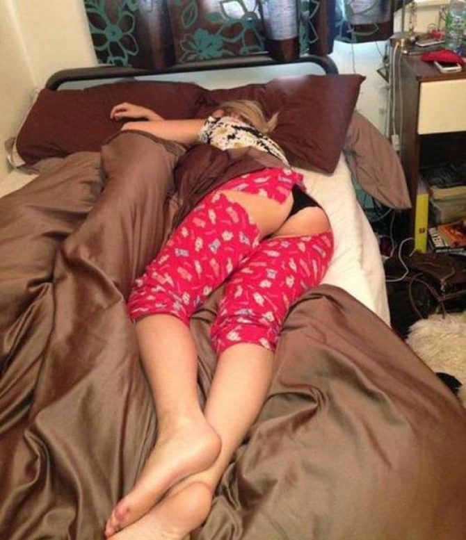 A adormit buştean, însă nu a realizat că arată mult mai mult decât ar fi dorit. Pantalonii fetei s-au rupt în fund, lăsând la vedere posteriorul bombat. Din fericire domnişoara poartă lenjerie intimă, minusculă ce-i drept, ceea ce-i mai salvează din ruşine.