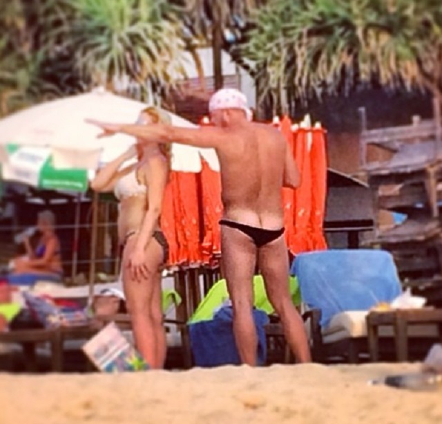 Bărbatul din fotografie apare cu fundul la vedere, spre plăcerea doamnelor, după ce a stat zile întregi la soare a observat că posteriorul îl are prea alb, aşa că şi-a achiziţionat o pereche de chiloţi tanga. Chiloţeii negri însă sunt prea mici pentru fundul lui şi în timp ce îi arată ceva unei femei pe plajă, un român aflat în vacanţă în Thailanda a surprins momentul jenant.