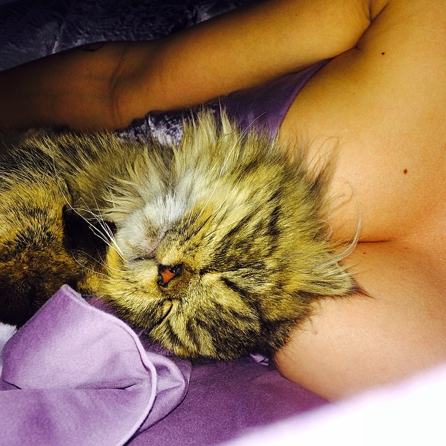 În timp ce tânăra dormea goală, pisicuţa s-a aşezat lângă ea şi a adormit cu capul pe fundul ei bombat. Prietenul fetei a imortalizat momentul şi a scris următorul mesaj pe net: "Mulţi bărbaţi s-au chinuit să urce munţi înalţi pentru a ajunge aici şi când reuşesc, sunt doborâţi de o pisicuţă".