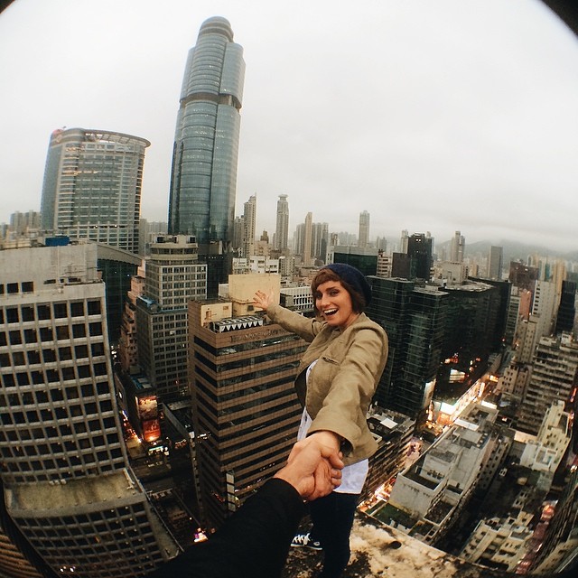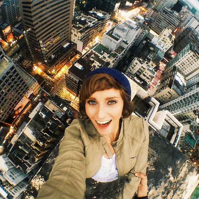 Fata s-a pozat deasupra oraşului, s-a urcat pe o clădire, iar prietenul ei o ţinea de mână în timp ce îşi făcea poza selfie. Şatena râde cu gura până la urechi şi este foarte entuziasmată.