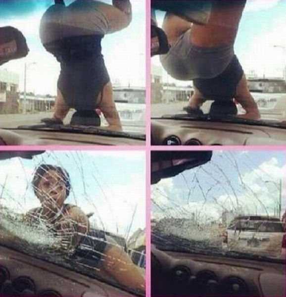 Homepage » Foto » E nebună sau nu? Uite cum a dansat tipa asta pe maşină până a spart parbrizul cu fundul imens