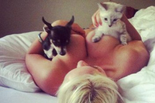 Blonda asta a vrut să-şi facă o fotografie provocatoare, însă animalele ei de companie, un căţel şi-o pisică, au tot intrat în cadru şi i-au stricat pozele. Pentru că nu reuşea nicium să le potolească, le-a luat în braţe şi le-a pus pe sâni, spre deliciul prietenilor ei de pe reţelele soiciale, care au văzut imaginea.