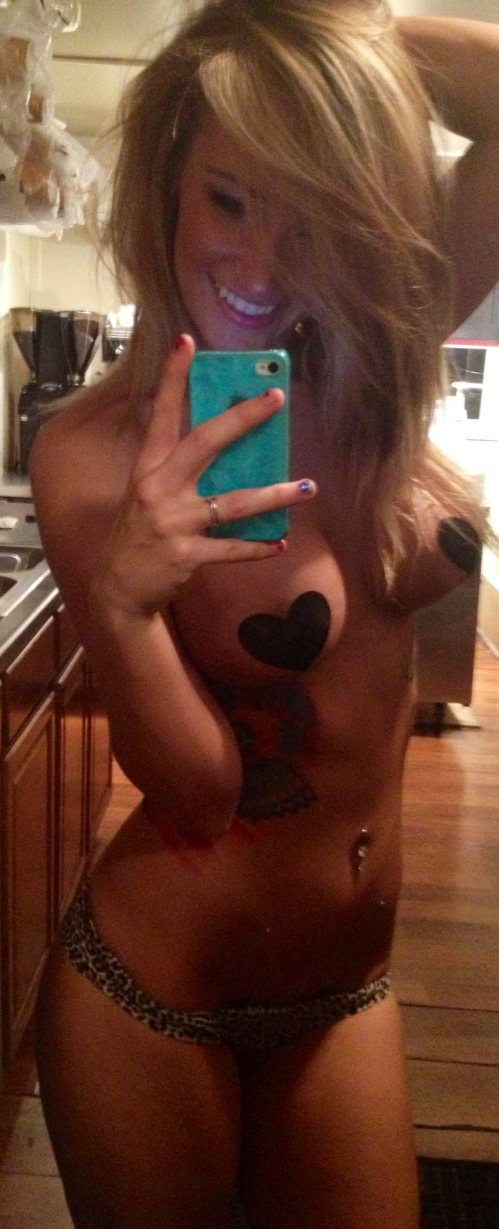 Blonda şi-a dat jos sutienul, şi-a acoperit sfârcurile cu două inimioare, după care şi-a tras chiloţii mai jos şi şi-a făcut o poză extrem de sexy. Atitudinea ei provocatoare şi aspectul răvăşit au făcut ca imaginaţia bărbaţilor s-o ia razna, mai ales că fata are sâni fermi şi corp aproape perfect.