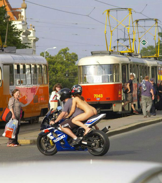 Fără inhibiţii, fata s-a urcat în pielea goală pe locul pasagerului de pe motocicleta prietenului său şi a pornit la drum. Ca să nu aibă probleme cu poliţia rutieră, tânăra a păstrat, totuşi, casca de protecţie. Trecătorii au rămas cu gura căscată şi nu şi-au mai putut lua ochii de la ea. Ai vrea să vezi aşa ceva şi la noi în ţară?