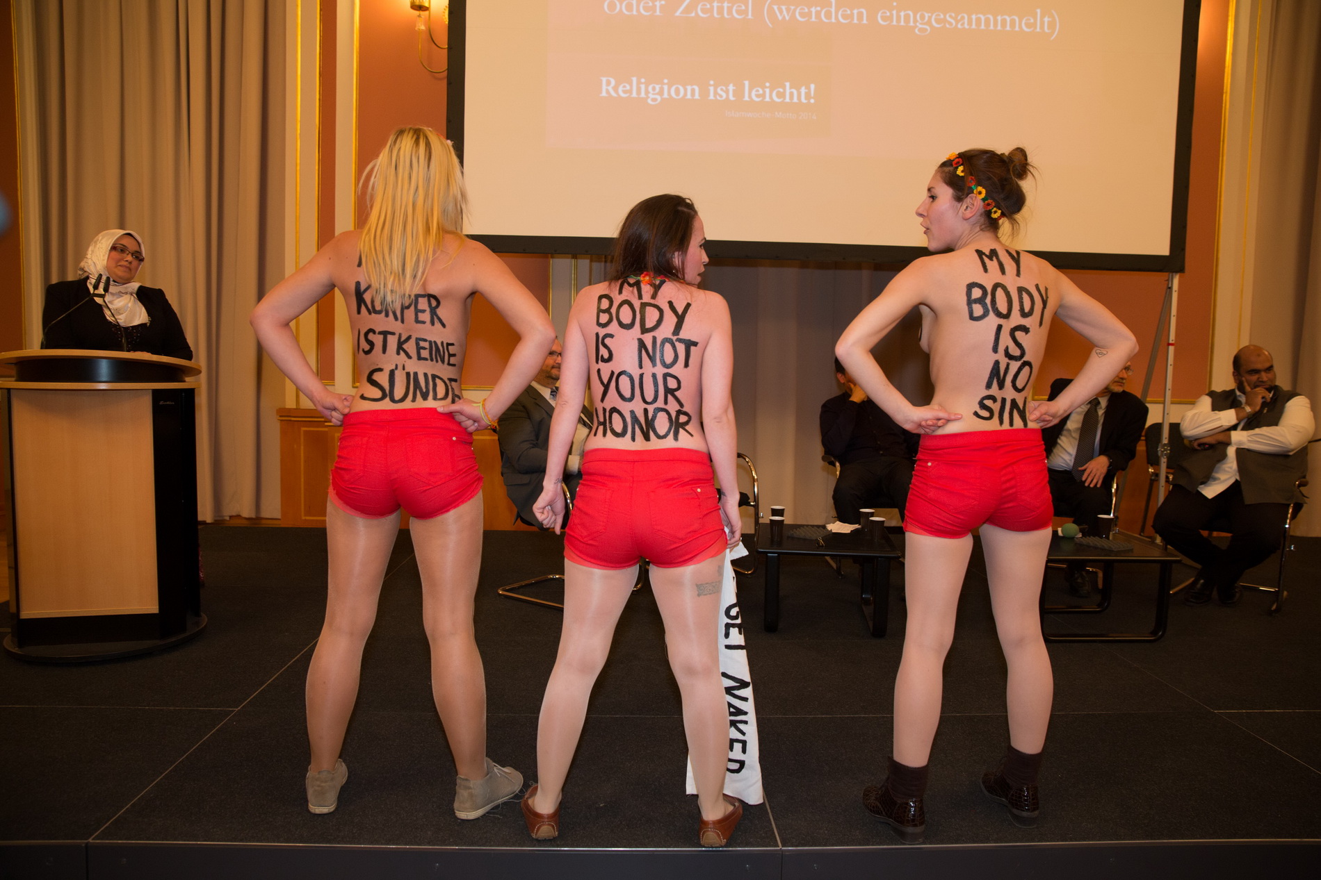 În unele ţări musulmane, restricţiile impuse femeilor sunt inumane. Nu au voie să-şi dezgolească trupul, iar în unele cazuri nici măcar faţa. Mai mult decât atât ele nu au libertatea de a ieşi neînsoţite de stradă, indiferent de momentul zilei. Mai multe tinere au ales să protesteze împotriva acestor restricţii în modul lor caracteristic. Acţiunea a atras cu siguranţă atenţia tuturor, cazul devenind intens mediatizat. Topless, în pantaloni scurţi roşii, fetele aveau scrise pe corp mesaje dure: "Corpul meu nu e onoarea ta", "Corpul meu nu este un păcat". Protestatarele au fost scoase din sală, cu forţa, de autorităţi.
