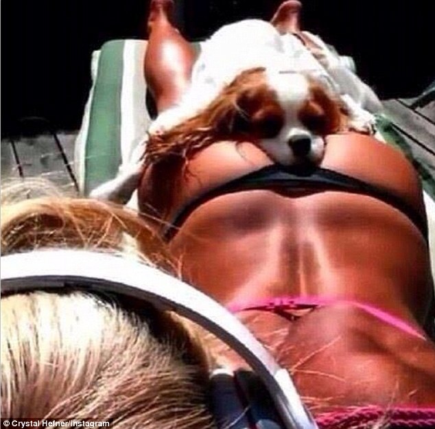 Bronzată, în costum de baie, blonda face plajă. Cu siguranţă soarele "nu o va prinde" uniform din moment ce între fesele ei doarme un căţel. Se pare că posteriorul bombat al lui Crystal a fost luat drept pernuţă de patrupedul drăguţ. Fotografia a strâns sute de mii de like-uri într-un timp record.